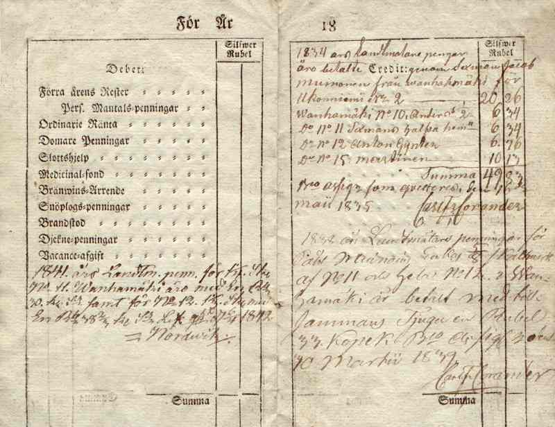 Seuraavissa kuvissa pari aukeamaa Sexman Jacob Muinosen (esi-isäni 5 sukupolvea taaksepäin) verokuittauskirjasta. Kirjaa oli käytetty kahteen tarkoitukseen, vuotuisten verojen kuittina ja nähtävästi Jaakko oli kerännyt kylältä Ukonniemeä myöten isonjaon maanmittarin palkkoja ja käynyt niitä maksamassa, näiden palkkojen kuittaajina olivat Nordwik ja Carl F. Corander.